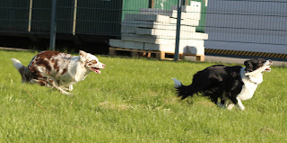 Chandler tapasi iiihanan bortsupojan tässä viimeviikolla. Hassua, että melkein naapurustossa asuvaan Lucky-poikaan ja Tiian ei oltu aiemmin törmättykään, mutta koirilla natsas kyllä saman tien (tai ketäpä Chämppy ei rakastaisi...) Ihana, pian 8 kk:n ikäinen Lucky oli kyllä hurmaava persoona ja vauhdikas agiliitelijän alku. Käytinpäs tilaisuutta hyväkseni ja kokeilin miten se toko sujuu häiriössä pitkän tauon jälkeen, ja eikait siinä mittään, oikein kuuliaisestihan tuo taas teki! Vähän luottavaisempi mieli lähteä sinne Kokkolaan ryhmän kanssa harjoittelemaan. :)