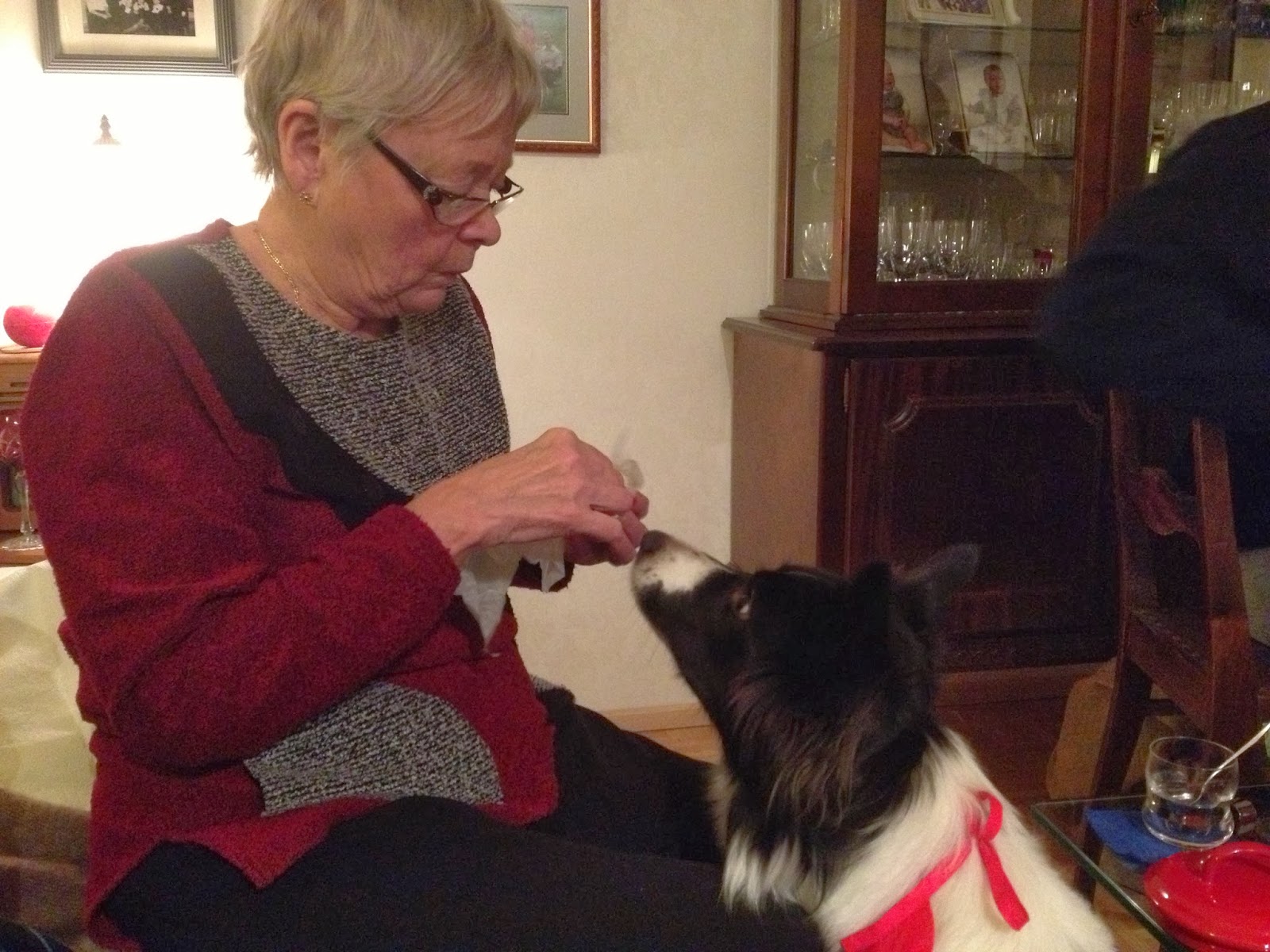 Tottakai Chämppy sai osansa jouluruuista. Varottiin antamasta paljoa, mutta jostain syystä aamulla neiti kärsi piparikrapulasta (?!) ja heti aamupusujen jälkeen oksensi kertaalleen Juhan peitolle, jonka hän juuri ja juuri kerkesi vetää itsensä suojaksi. :D No, huonosta olosta ei sen jälkeen ollut onneksi merkkiäkään.